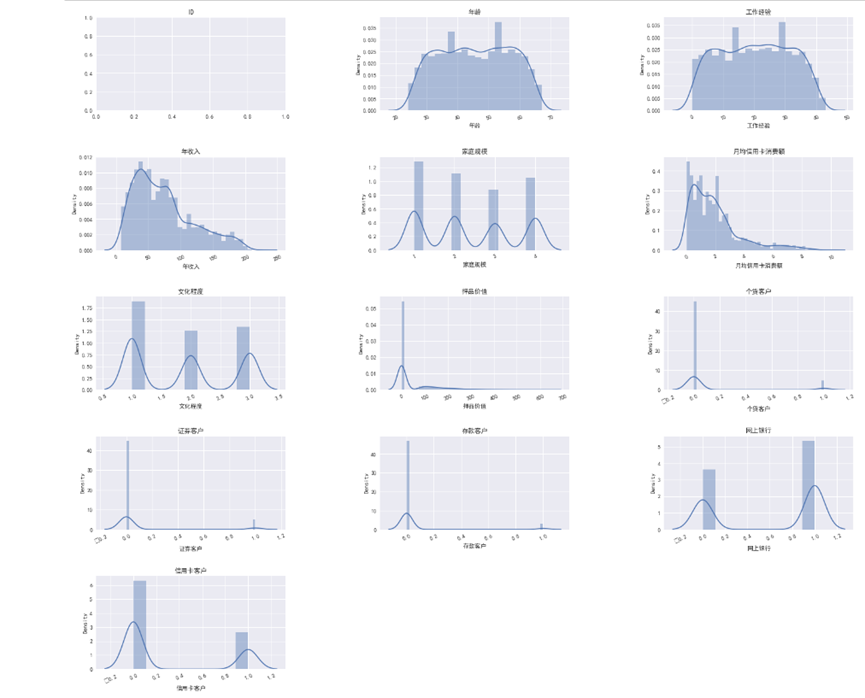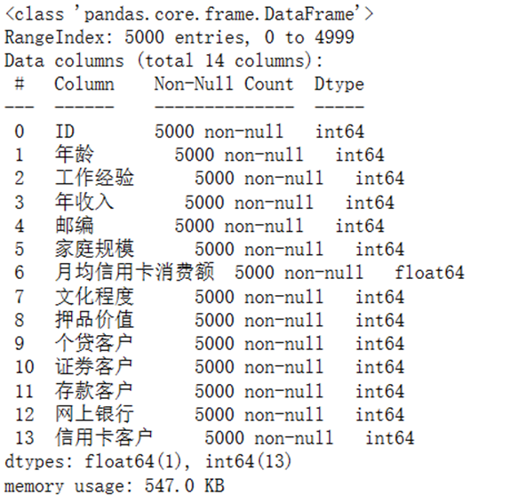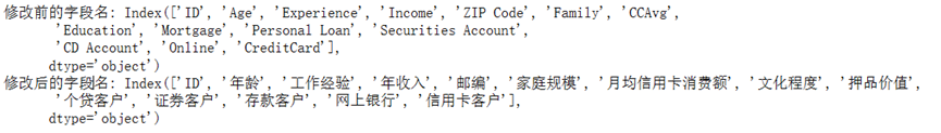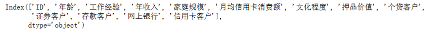 df.columns = ['ID','年龄','工作经验','年收入','邮编','家庭规模','月均信用卡消费额','文化程度', '押品价值','个贷客户','证券客户','存款客户','网上银行','信用卡客户']