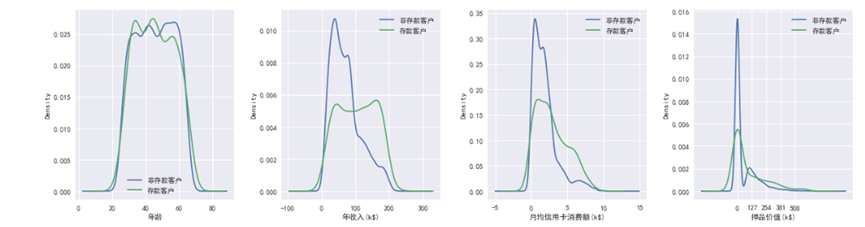 # 1.1存款和非存款客户在年龄、年收入、月均信用卡消费额和押品价值上的分布差异