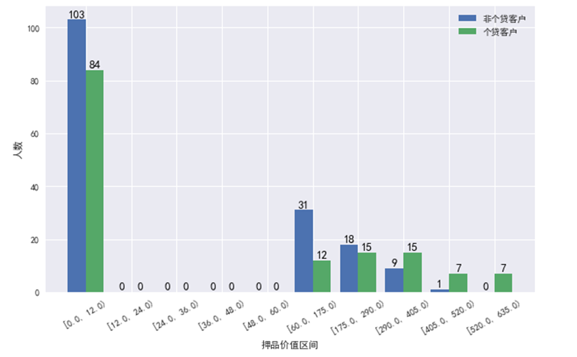 cutbar(bardata_cdnotloamor,bardata_cdloamor,10,'押品价值区间','人数','非个贷客户','个贷客户')