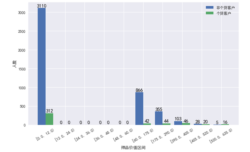 cutbar(bardata_notcdmor,bardata_cdmor,10,'押品价值区间','人数','非个贷客户','个贷客户')