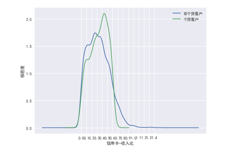 分析: ①:非个贷客户信用卡消费额占其收入的比重集中在20%左右,而个贷客户的信用卡消费额占其收入的比重集中在40%左右;同时,在20%到40%这一区间内,非个贷客户的核密度曲线急剧下降,而个贷客户的核密度曲线急剧上升并达到峰值,可见信用卡-收入比在30%到40%之间的客户办理个贷业务的倾向最强。但当信用卡消费额占收入的比重超过65%以后,个贷客户数量的下降幅度要大于非个贷客户,可见虽然大部分非个贷客户对信用卡的使用较为保守,但也存在小部分不理性使用信用卡的客户。