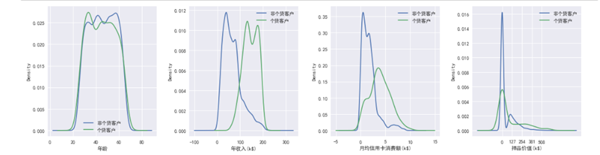multi_kde(df.loc[:,['个贷客户','年龄','年收入','月均信用卡消费额','押品价值']],