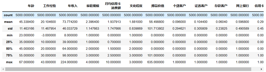 本案例是基于客户的基本信息(年龄、工作经验、年收入、邮政编码、家庭规模、文化程度、押品价值、月均信用卡消费额、存款客户、信用卡客户、证券客户、网上银行、个贷客户等)对客户情况进行分析。得出以下数据:
