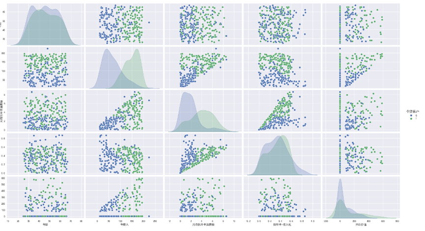 分析:①:从相关性矩阵散点图可以看出,存款客户中个贷和非个贷客户在年收入和月均信用卡消费额上的区分度比较高,具体来说,年收入在10.2万美元以上且月均信用卡消费额在3千美元以上的存款客户办理个贷业务的倾向非常强;②:在信用卡收入比方面,在0.65的水平以内二者的区分度不高,但超过0.65的水平后,非个贷的存款客户要多于个贷存款客户;③:在押品价值方面,存款个贷和存款非个贷客户的押品价值都集中在0值附近,进一步对押品价值分箱处理后发现,存款个贷和存款非个贷客户中绝大多数都没有住房抵押(押品价值为0),同时当押品价值高于400万美元后,存款个贷客户比存款非个贷客户要多。