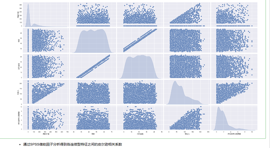结论:(1)数值分布分析:①押品价值多分布在0附近,说明绝大部分人没有住房抵押;还有一些客户大部分押品价值都在10万美元左右;②年龄多分布在30-60之间;③绝大多数客户的工作经验1趋于10年-30年之间,说明绝不部分的客户都是出社会的人;④年收入集中在4万到7.5万美元间,⑤月卡消费额度:集中在0.2到2千美元间;(2)相关性分析:(查阅数值型相关性 (2).png 或者因子分析数值相关性.png)①:年龄与工作经验的r趋近于1,说明有较强的相关性,虽然与年收入和月卡消费额度存在相关性,但是|r|只有0.5左右,相关性较弱②:年收入跟月卡消费额度和押品价值存在相关性,而且都是正相关,说明年收入越大,消费的额度也就越大,押品的价值也越高。