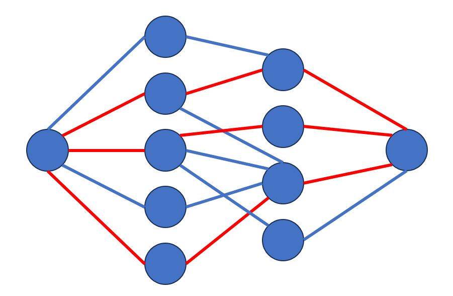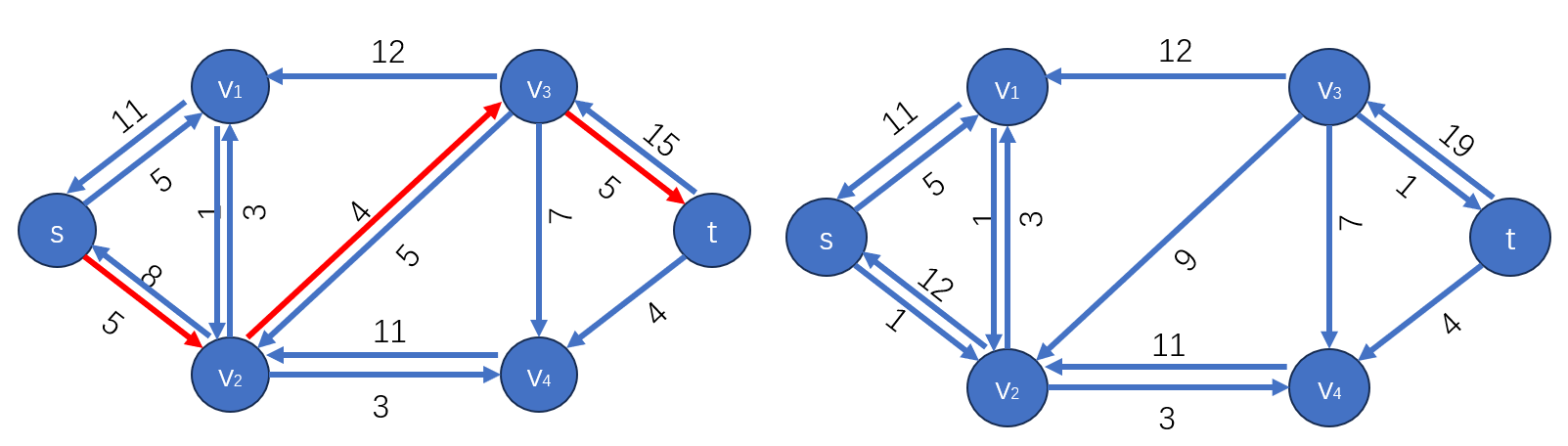 左图即为按照 b 图绘制的残存网络,而标红的则是其一条增广路径,在这里我们不难发现右图中从 s 到 t 已经没有增广路径了,而此时的流即为最大流