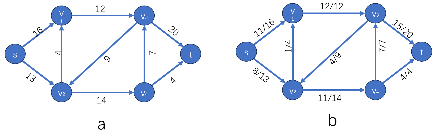 a 图为一开始的容量图,箭头上的数字代表容量; b 图为取最大流时的流网络图,此处的 / 仅起到区分流和容量的作用