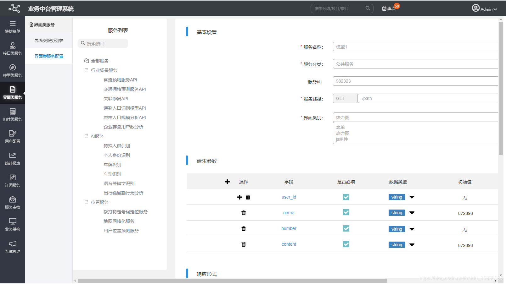 业务中台管理系统、业务中台架构、接口类服务、模型类服务、界面类服务、组件类服务、服务架构、中后台、服务审核、AI服务、位置服务、行业场景服务、企业中台、接口配置、模型配置、数据处理、结构化数据、数据源