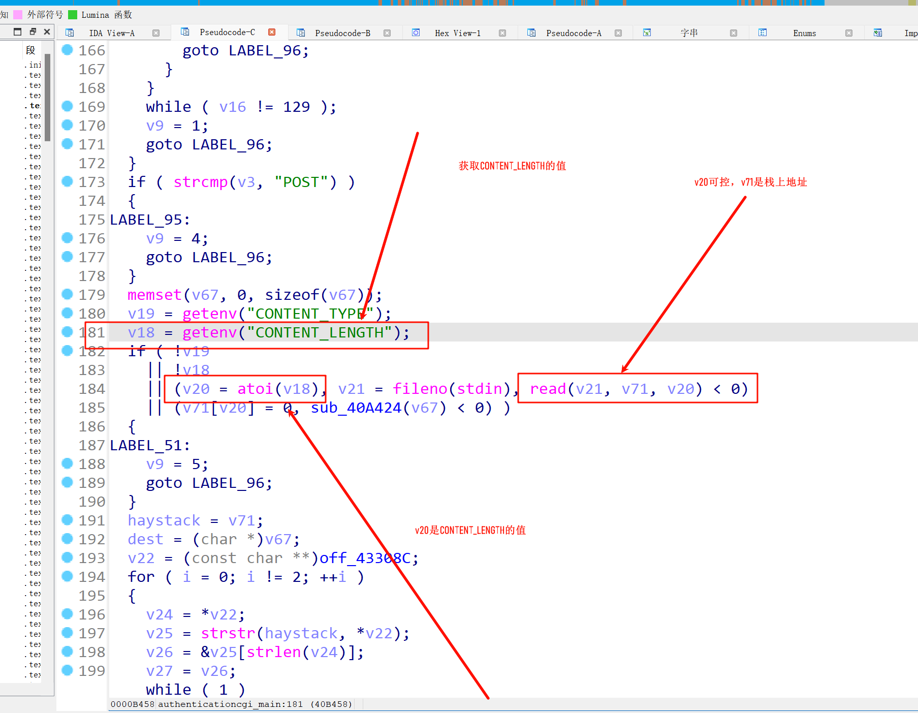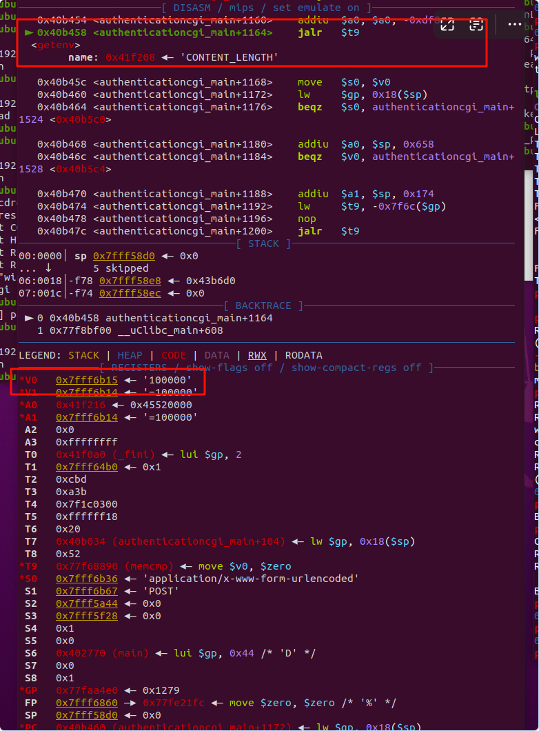 该漏洞是CGI脚本在处理authentication.cgi请求,将请求头的CONTENT_LENGTH值作为read函数读取文件的内容大小,由于该值可控,因此造成read函数的缓冲区溢出。