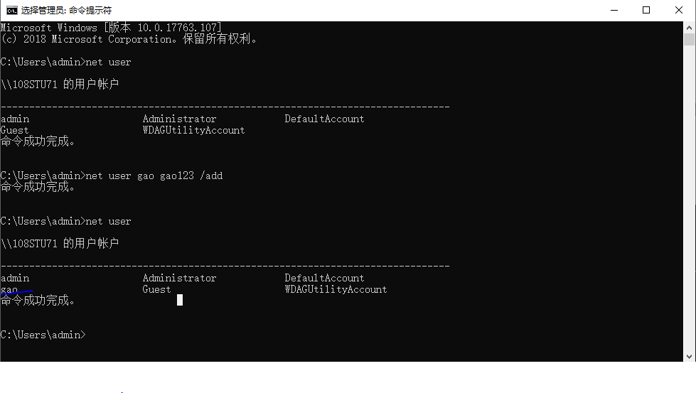 1.在windows xp系统中使用 net user gao gao123 /add添加用户gao,密码gao123的账户(用户名和密码可以自己设定);并使用net user命令确定用户添加成功。
