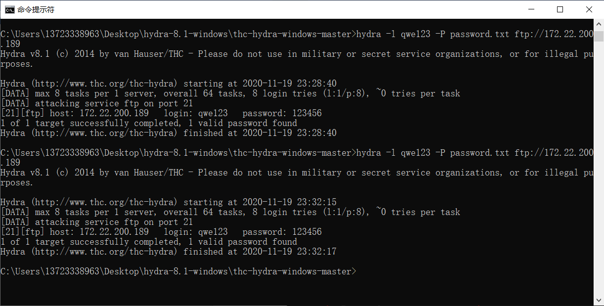 2.B同学使用hydra 对ftp用户的密码进行字典破解。hydra 中有关于该软件的使用命令语法。字典文件需要自己去生成。