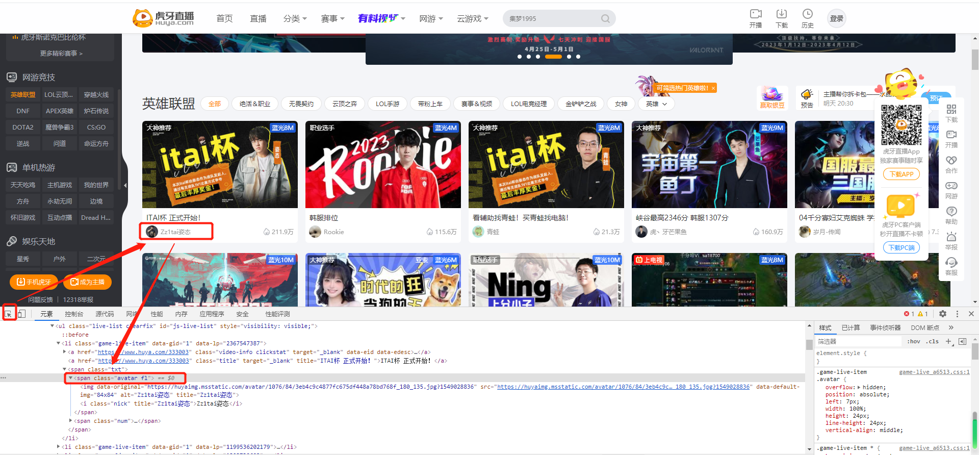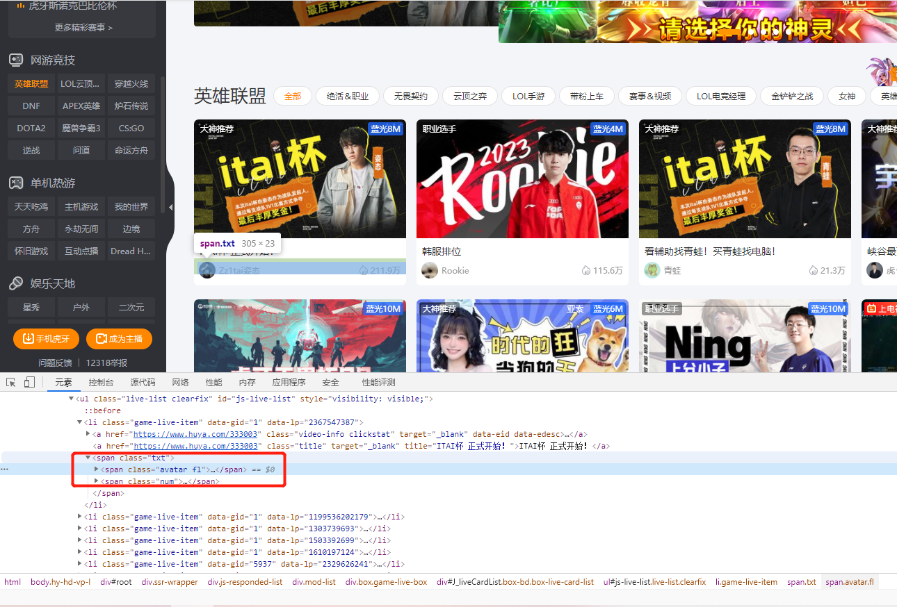 首先获得数据定位 按F12打开控制台,点击左上角抓取其中一个直播间的主播名称,观看人数同样操作