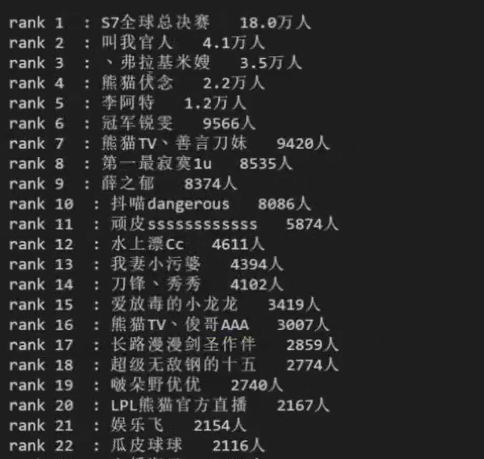 1 import re 2 from urllib import request 3 4 class Spider(): 5 url="https://www.huya.com/g/lol" 6 #正则表达式 匹配内容,爬取的内容 7 root_pattern ='<div class ="txt">([\s\S]*?)</div>' 8 #root_pattern ='<div class ="txt">[\s\S]*?</div>' *可以读取多个字符 ?选择非贪婪模式 ()只选择前面标签里面的信息 9 #匹配的方式 10 #\w 单词字符 \W 11 #\s 空白字符\W 12 #. 匹配除换行符\n之外其他所有字符 13 name_pattern ='</i>([\s\S]*?)</span>' 14 number_pattern='<span class="num">[\s\S]*?)</span>' 15 def __fetch_content(self): 16 r= request.urlopen(Spider.url) 17 htmls = r.read() 18 htmls =str(htmls,encoding='utf-8') 19 return htmls 20 def __analysis(self, htmls): 21 root_html = re.findall(Spider.root_pattern,htmls) 22 anchors=[] 23 for htlm in root_html: 24 name = re.findall(Spider.name_pattern,html) 25 number = re.findall(Spider.number_pattern,html) 26 anchor ={'name':name,'number':number} 27 anchors.append(anchor) 28 return anchors 29 #已经获得数据,精炼数据,规范结构 30 def __refine(self,anchors): 31 l = lambda anchor:{ 32 'name':anchor['name'][0].strip(), 33 'number':anchor['number'][0] 34 } 35 return map(l,anchors) 36 #strip 去除空格python内置函数 37 def __sort(self,anchors): 38 anchors =sorted(anchors,key=self.__sort_seed(),reverse=True) 39 return anchors 40 41 def __sort_seed(self,anchor): 42 r=re.findall('\d*',anchor['number']) 43 # 加 * 是多个 相当于 *n 44 number = float(r[0]) 45 if '万' in anchor['number']: 46 number *=10000 47 return anchor['number'] 48 49 def _show(self,anchors): 50 for rank in range(0,len(anchors)): 51 print('rank ' + str(rank + 1)+ ':'+ anchors[rank]['name'] + ' '+ anchors[rank]['number']) 52 53 def go(self): 54 htmls =self.__fetch_content() 55 anchors=self.__fetch_content() 56 anchors=list(self.__refine(anchors)) 57 anchors =self.__sort(anchors) 58 self.__show(anchors) 59 60 61 62 spider =Spider() 63 spider.go()