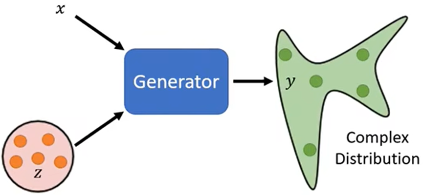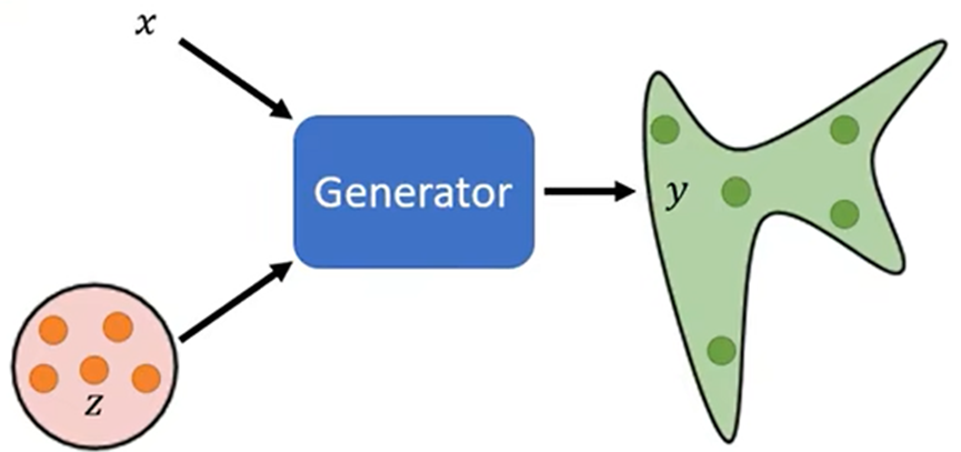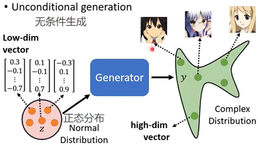 - 把Network当成生成使用;输入另加一个参数z,这个z为某个Distribution(分布)中抽取得来,不固定;