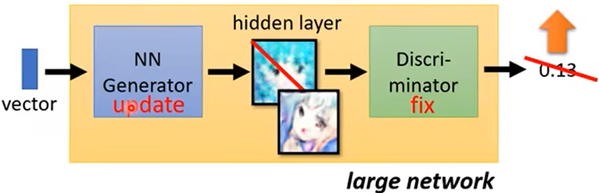 - 定住Discriminator,只训练Generator(让Generator想方法骗过Discriminator)