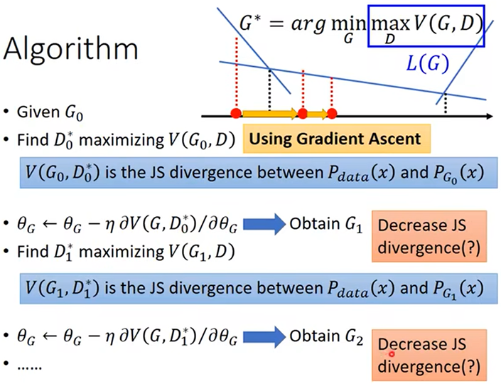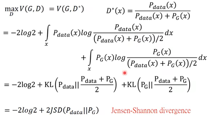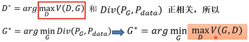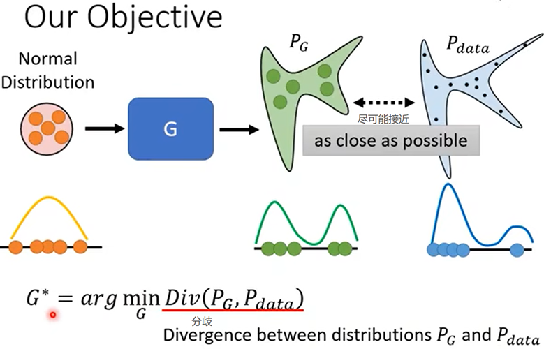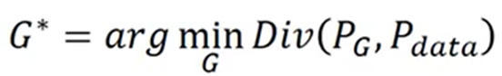 - 机器训练出的分布设为Pg,真实的最佳分布为Pdata,所以要找出那个与Pdata分歧(divergence)最小的分布Pg: