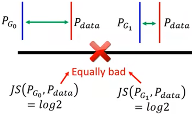 - Pg和Pdata数据的重叠部分很少,所以当不重叠时,JS Divergence就不能训练参数(直觉:如果两个分布不重叠,二进制分类器达到100%的正确率)