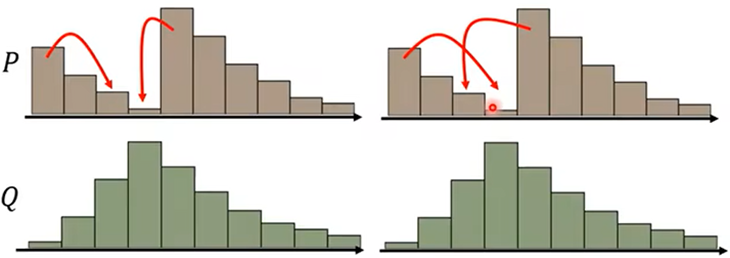 - Wasserstein Distance:两个分布P和Q,把P分布的图像转化成Q分布图像要移动的点的平均距离作为P和Q的相似程度: