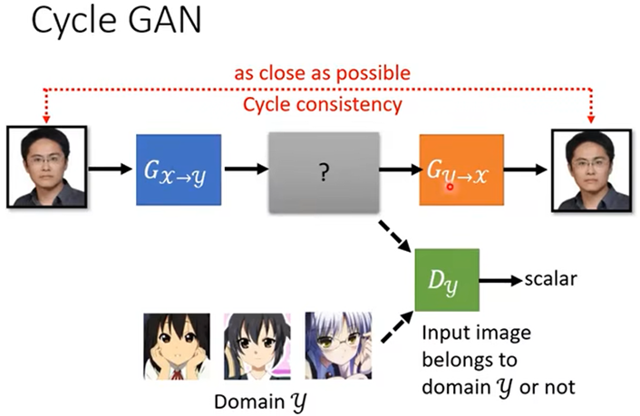 Cycle GAN:训练两个Generator,第一个用于把X域的图转换为Y域的图,第二个用于把Y域的图还原为X域的图,让输入和输出越接近越好,Discriminator(辨别者)用于辨别第一个Generator生成的图片是否为Y域的图片