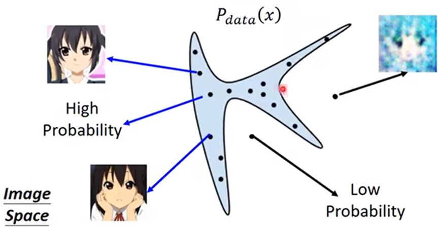 理论:如果要生成一张人脸图片,每张图片可以当成高维度空间的一个点,在整个高维空间中只有少部分的点是人脸图片,并且这些点在高维空间中有某个固定的分布,GAN做的事就是找出这个分布。