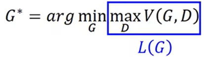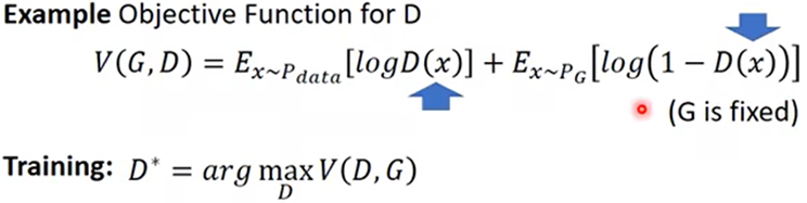 训练Discriminator,达到分辨“假钞”的目的,让其对Pg中图片分数越低越好,对Pdata中图片分数越高越好。所以设一个函数,只与Generator和Discriminator有关,在训练Discriminator时会让Generator停止训练