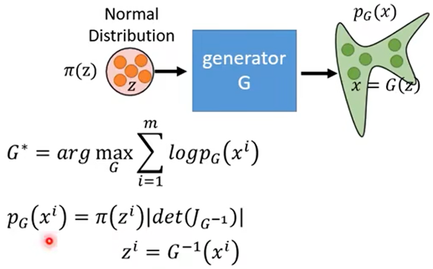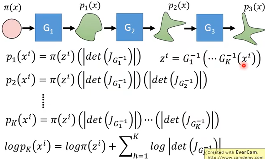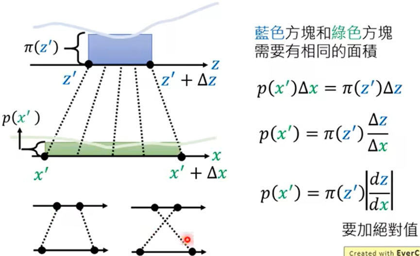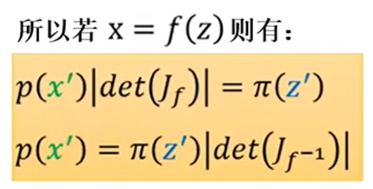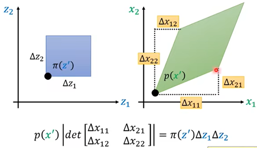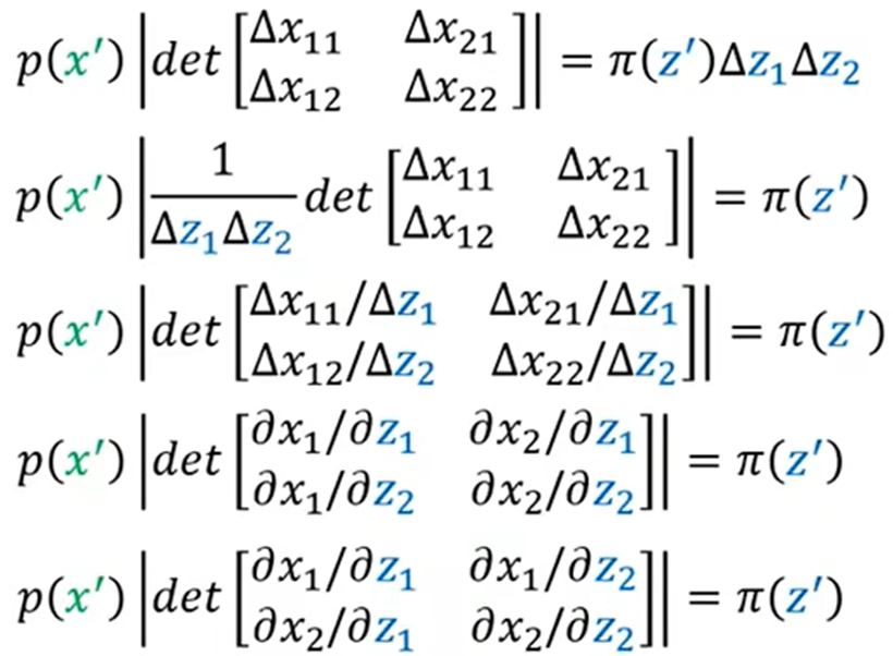 - change of variable theorem(变元定理):分布π转换成p之后,π上点z’相应的移动到x’,z’移动∆z后,x’相应的移动∆x,其中保证π(z’) ∆z=p(x’) ∆x;当∆x趋近于0时,变得到了π(z’)与p(x’)之间的关系