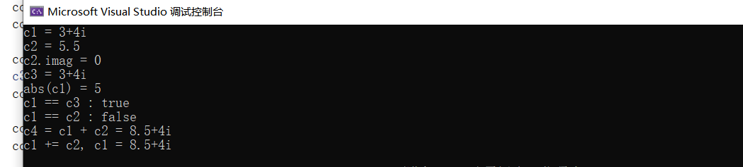 1 #include"c.hpp" 2 #include <iostream> 3 #include<iomanip> 4 int main() 5 { 6 using namespace std; 7 8 my_complex c1(3, 4); 9 const my_complex c2(5.5); 10 my_complex c3(c1); 11 12 cout << "c1 = "; 13 c1.show(); 14 cout << endl; 15 16 cout << "c2 = "; 17 c2.show(); 18 cout << endl; 19 cout << "c2.imag = " << c2.get_imag() << endl; 20 21 cout << "c3 = "; 22 c3.show(); 23 cout << endl; 24 25 cout << "abs(c1) = "; 26 cout << abs(c1) << endl; 27 28 cout << boolalpha; 29 cout << "c1 == c3 : " << is_equal(c1, c3) << endl; 30 cout << "c1 == c2 : " << is_equal(c1, c2) << endl; 31 32 my_complex c4; 33 c4 = add(c1, c2); 34 cout << "c4 = c1 + c2 = "; 35 c4.show(); 36 cout << endl; 37 38 c1.add(c2); 39 cout << "c1 += c2, " << "c1 = "; 40 c1.show(); 41 cout << endl; 42 return 0; 43 }