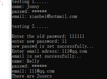 1 #include "User.hpp" 2 #include <iostream> 3 #include<string> 4 int main() 5 { 6 using namespace std; 7 8 cout << "testing 1......" ; 9 User user1("Jonny", "114514", "xianbei@hotmail.com"); 10 user1.print_info(); 11 12 cout << endl 13 << "testing 2......" << endl 14 ; 15 User user2("Belly"); 16 user2.change_passwd(); 17 user2.set_email(); 18 user2.print_info(); 19 20 User::print_n(); 21 }