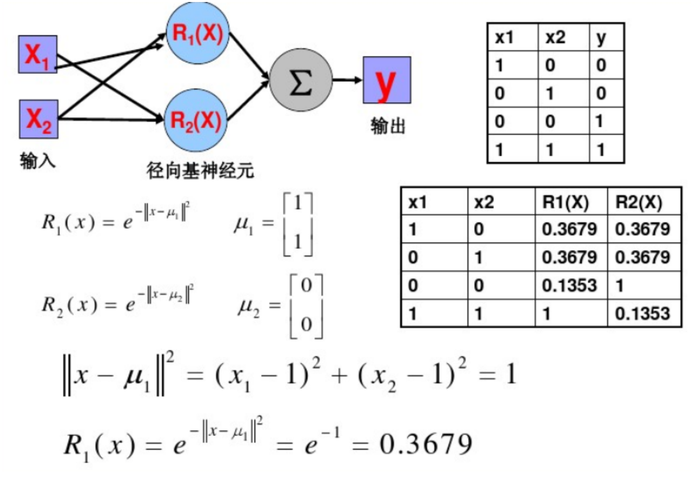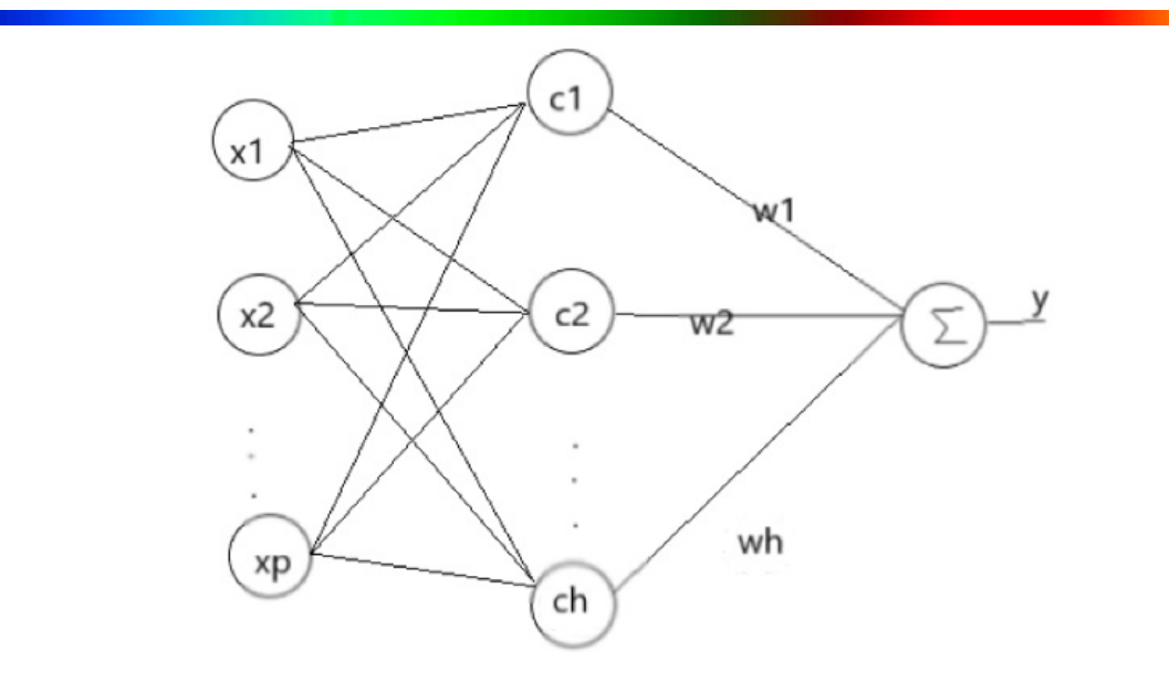 - 隐层节点激活函数为径向基函数,输出节点激活函数为线性函数