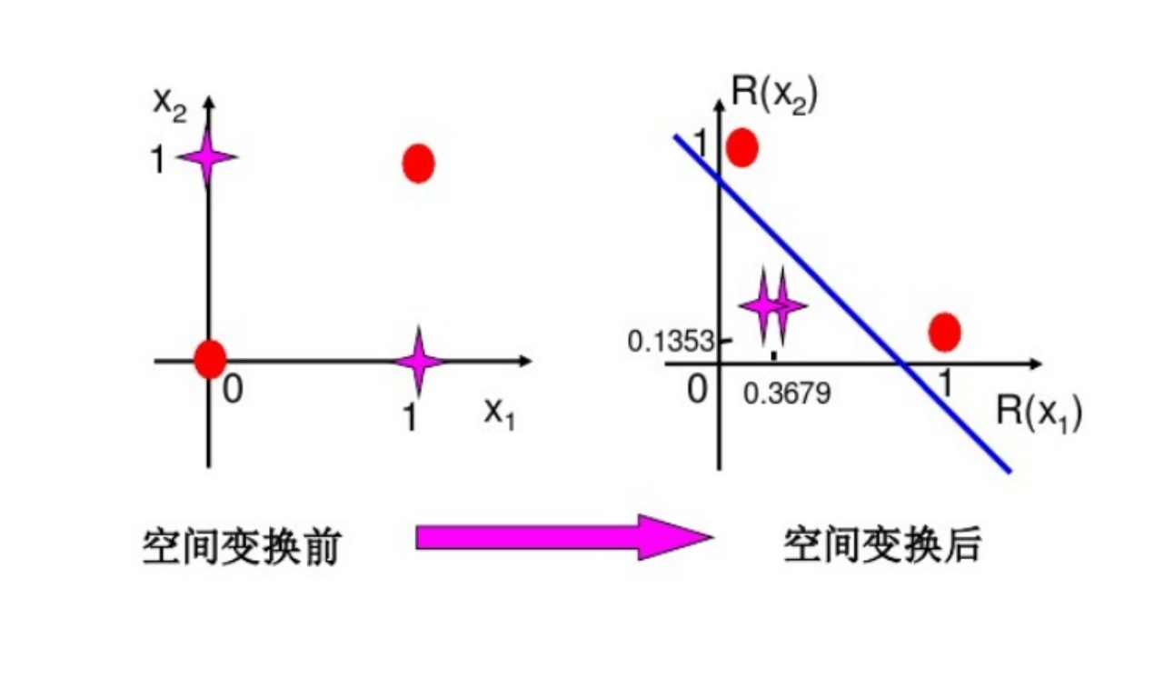 - 解决非线性可分问题。RBF网络用隐层单元先将非线性可分的输入空间设法变换到线性可分的特征空间(通常是高维空间)使得在低维空间内的线性不可分问题在高维空间内线性可分,然后用输出层来进行线性划分,完成分类功能。