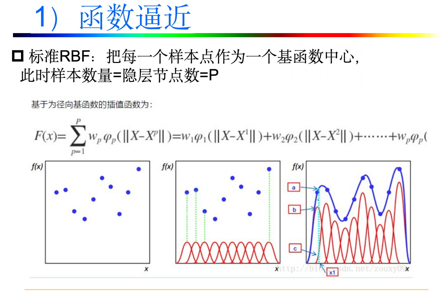 - 以任意精度逼近任一连续函数。一般函数都可以表示为一组基函数的线性组合。RBF网络相当于用隐层节点的输出构成一组基函数,然后用输出层来进行线性组合,以完成逼近功能。
