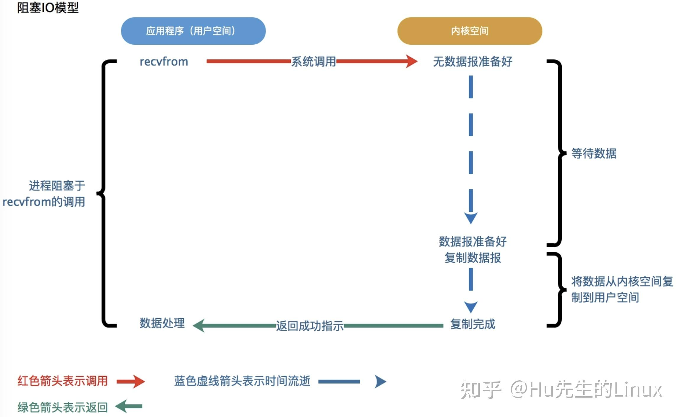 应用程序调用一个IO函数,导致应用程序阻塞,等待数据准备好。 如果数据没有准备好,一直等待….数据准备好了,从内核拷贝到用户空间,IO函数返回成功指示。