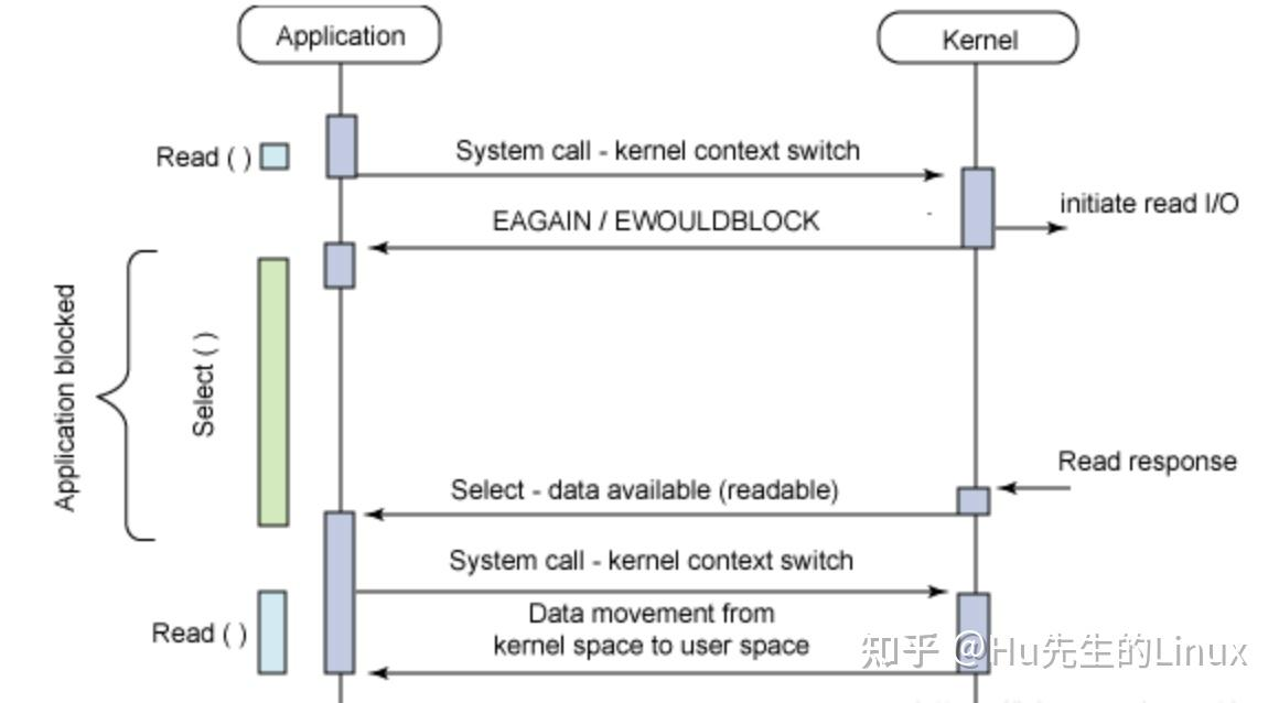 当用户进程调用了select,那么整个进程会被block;而同时,kernel会“监视”所有select负责的socket;当任何一个socket中的数据准备好了,select就会返回。这个时候,用户进程再调用read操作,将数据从kernel拷贝到用户进程。