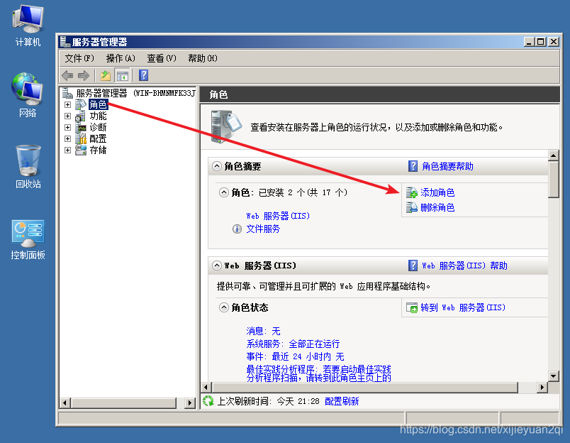 计算机 -> 右键 -> 管理 -> 角色-> 添加角色