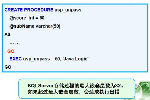 SQLServer存储过程的最大嵌套层数为32。 如果超过最大嵌套层数,会造成执行出错