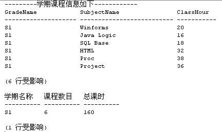 CREATE PROCEDURE usp_query_subject @CourseNum INT OUTPUT, @HourNum INT OUTPUT, @GradeName VARCHAR(50) AS …… SELECT GradeName,SubjectName,ClassHour FROM Grade LEFT JOIN Subject ON Grade.GradeId=Subject.GradeId WHERE GradeName=@GradeName SELECT @CourseNum=COUNT(0), @HourNum=SUM(ClassHour) FROM Grade INNER JOIN Subject ON Grade.GradeId=Subject.GradeId WHERE GradeName=@GradeName GO