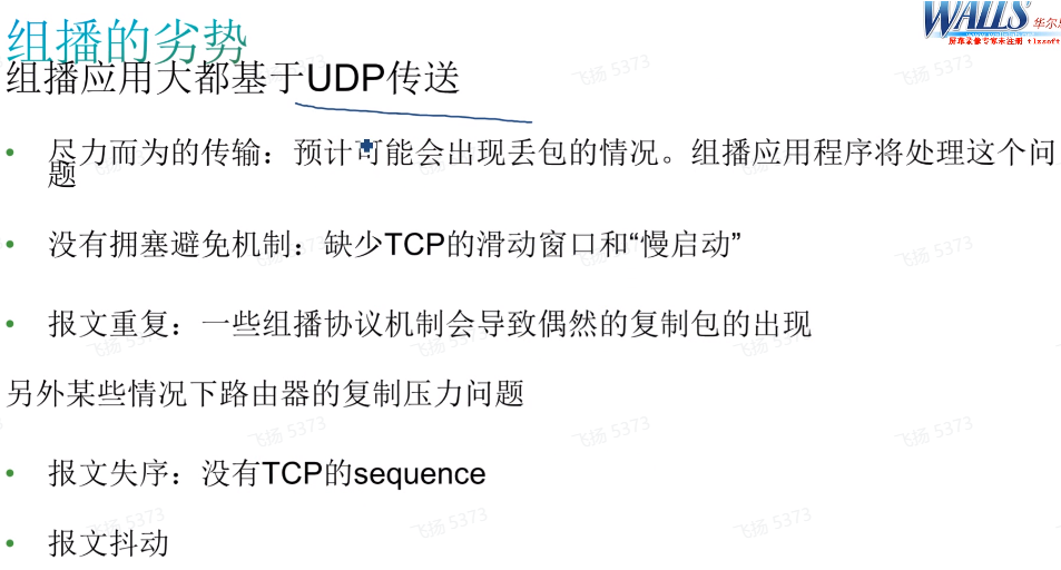 组播的业务都是基于实时应用的,ex音频或者视频业务,这种类型的业务除非丢包太多,延时太大,才会影响到业务。udp会导致端口的拥塞,如果组播的带宽超过了端口的带宽,就会造成端口的拥塞,并且udp没有慢启动机制。