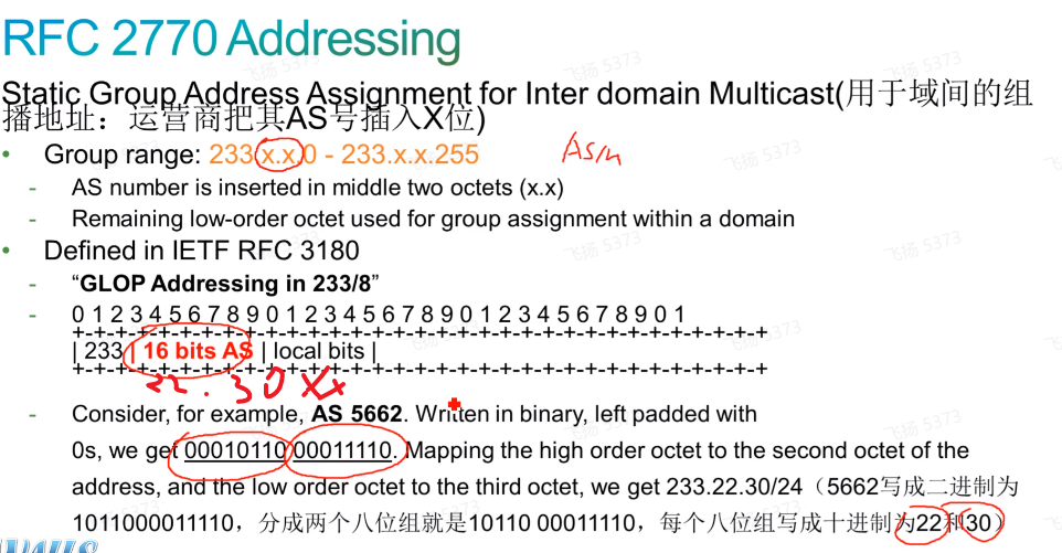 Glop address,可以在地址内嵌入bgp的as no,中间两个字节(0.0)适用于映射bgp的as no。因为其只能映射两字节,就只能用于2B的as no