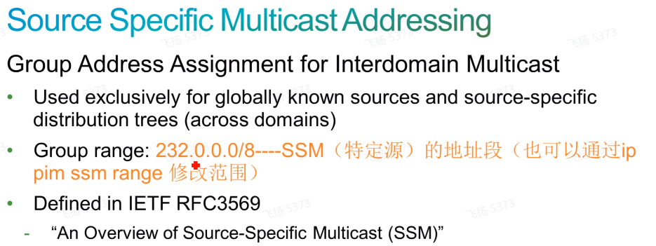 但有了sm后,就不需要rp和msdp,因为接收者在加组时已经指定了组播源,叶路由器在收到报告后,就能知道组播源是谁,叶路由器就可以直接向组播源发起s,g的join,直接构建源-叶路由器的最短路径树,这样即便是跨域,只要保证叶路由器到达组播源的路由可达,并且沿路的设备上都开启pim就可以了,所以说ssm可以让网络更加的简单,so ssm才是为了组播网络部署的关键模型。ssm的地址范围为:232.0.0.0-232.255.255.255(完整的组播范围 224-239,且239是保留的组播私有地址)