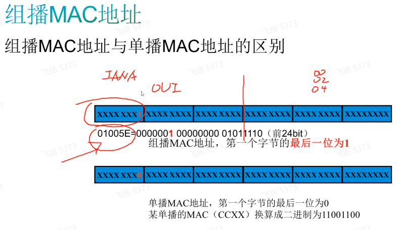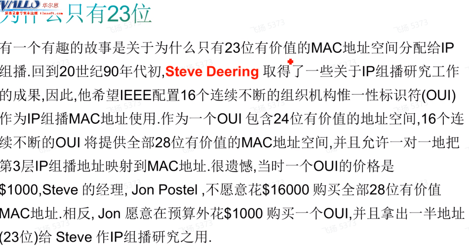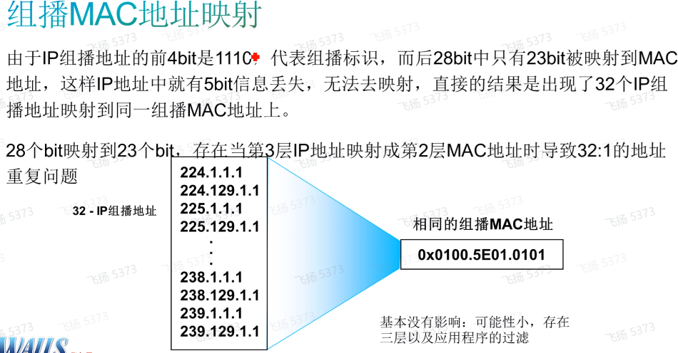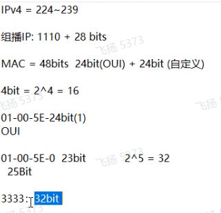 买的这个mac地址,oui部分就是01005e,然后老板把第25b 为1 的部分拿走,只为组播留下了01005e0…的23b,28(ipv4组播ip的28bit变换位)-23(组播mac变化位)=5位,造成2的5次方32个ipv4地址映射到同一个组播mac(把28个bit映射为23个bit会造成最前面5gbit的丢失)