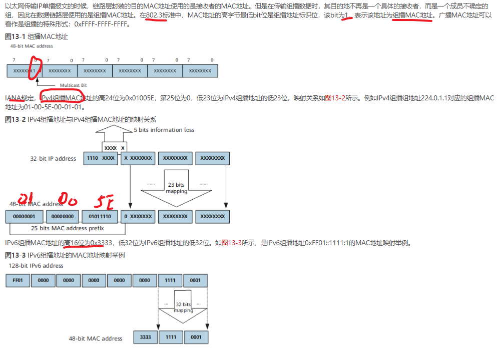 Ipv6中解决了该问题,ipv6组播地址只用到了前16个bit,即3333::开头的,来代表ipv6的组播ip,把后面32b用来映射ipv6的组播地址。在ipv6中group的长度正好是32位,而mac也是剩余了32位,就可以保证ipv6地址和mac地址之间1:1的映射关系(如下图:)