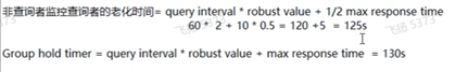 上面第二个公式是igmp组的最大老化时间。这两个时间的设置是合理的,避免组已经被老化了,但还没发现监听者故障。So 监听查询者的老化时间一定要小于组的老化时间。