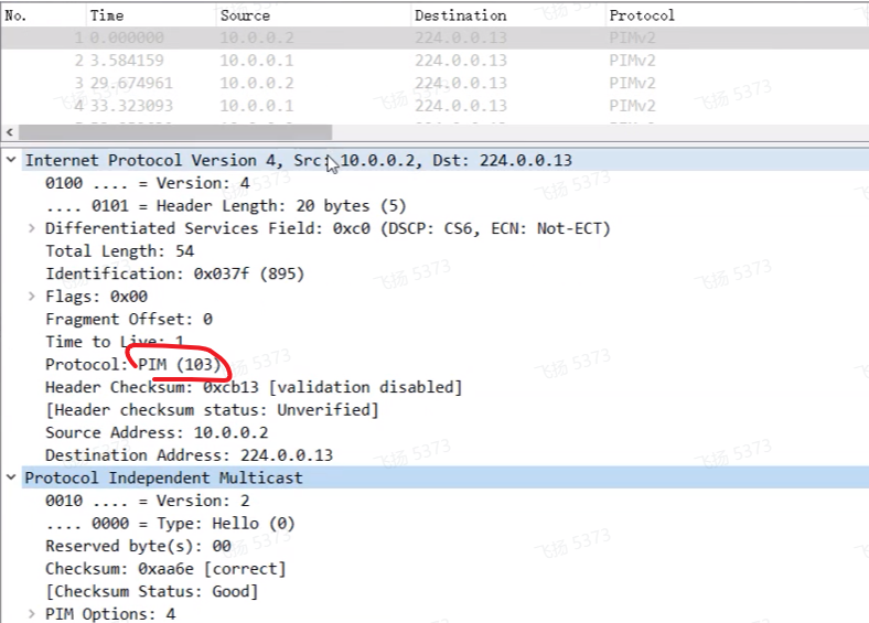 Pim 的hold time是3.5倍的hello,105s,当前使用的版本是v2,类型来标识不同的报文,ex这里是hello报文