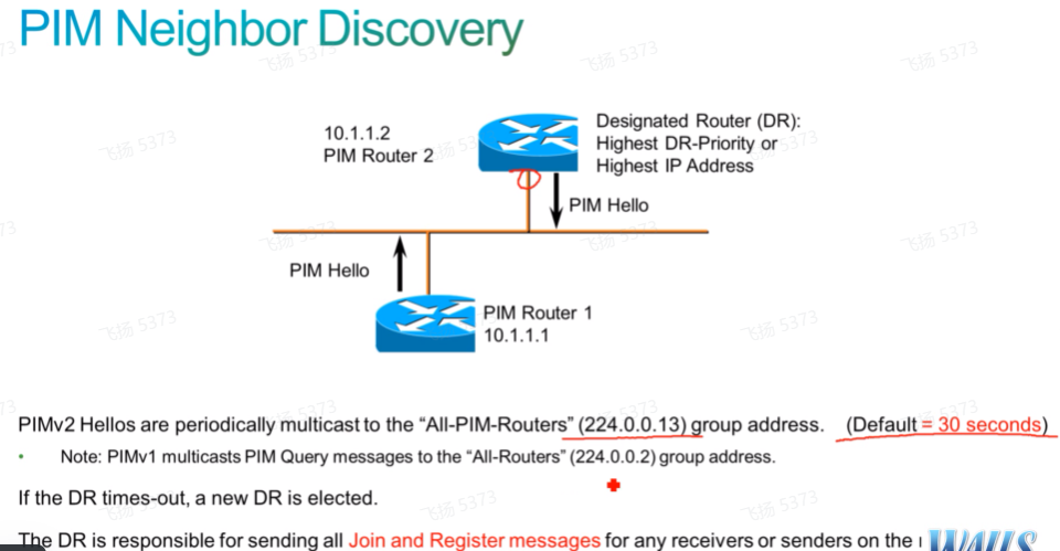 pim的邻居发现也是基于组播来发现的,类似于ospf,只不过pim发送的组播组地址是224.0.0.13。只要if开启pim-sm/dm,都会向224.0.0.13这个组发送hello,发现直连的邻居关系。pim里只支持直连邻居关系的建立。 .2只代表路由器,.1包括所有设备,比如还有pc。在广播网中,还需要选举出dr