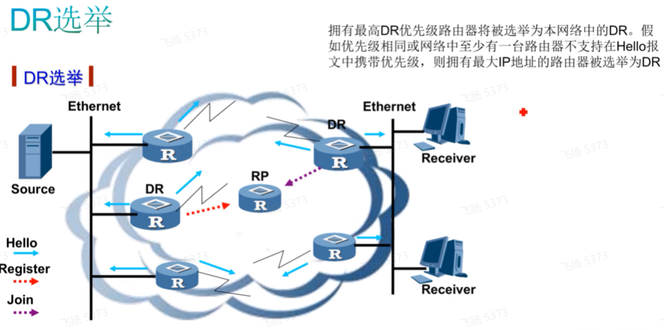 在pim-sm模型中,第一跳路由器在收到组播源发送的组播流量后,需要向rp发送注册报文-封装成单播报文发送给rp,但是这个注册报文由哪台第一跳路由器发送?就需要选出源端dr,由源端dr来发送。