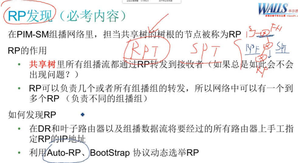 在pim-sm网络中需要配置rp的:1.静态指定(在设备上配置静态rp就行了。部署时要考虑哪些路由器需要配置静态rp:在rpt树里的所有设备都需要配置,ex 叶路由-rp及之间经过的路由器。从rp到达组播源的spt树上有哪些需要配置:第一跳路由器需要配置(//因fh要向rp发送源注册报文),而中间的中转设备不需要配置,并且需要保证第一跳和中间的路由器到达rp是路由可达的,如果不可达,可能导致rpf检查失败,就不能继续转发流量);