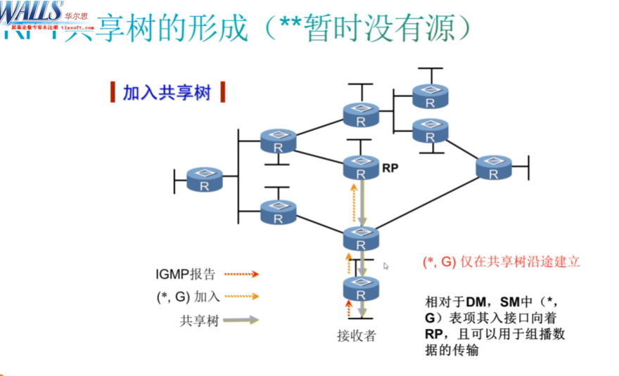 叶路由器到达rp是通过一个广播网多路径可达,如果叶路由器计算出是走左边,那右边的设备也会收到*,g的join,但由于这个报文里携带的up nei并不是我接口的ip地址,就说明这个报文不是给我的,就会丢弃。so在这里,只有左边的设备会在本地生成*,g的转发表项,并把报文继续转发给rp,而右边哪台设备收到也会丢弃,在本地也不会创建*,g的转发表。这里是通过 upstream nei来标识,这个join报文应该由谁来处理。这样就可以在叶路由器和rp之间建立一颗spt,但现在还没有流量,只是通过这种*,g的join方式,让rp知道了这个组播组里有接收者,但还没有流量过来,so在这张图里,只是建立了一个共享树,暂时没有源。