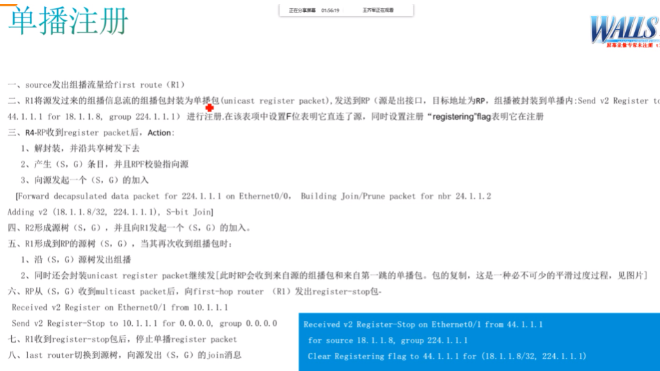如果rp上没有*,g的表项,就意味着rpt里没有接收者要接收这个组播组的流量,则rp不会继续转发给接收者,如果继续转发则完全是浪费带宽。so在rp上面,如果找不到匹配的*,g表项,就会忽略到注册报文。虽然会忽略,但同样会在本地为这个组播流量生成一个s,g的表项。因:现在虽然没有接收者,但是后面如果有接收者需要接收这个组播组流量的话,而我本地不知道组播源存在的话,接收者是不能接收到组播流量的。如果我能提前为我能接收到的组播流生成一个S,g的表项,一旦有接收者需要接收组播流量的话,那我可以按之前生成的表项向组播源发送s,g的join,吧流量引过来。So 我需要提前维护一个s,g的表,知道源的存在,这样可以实现一个接收者需要接收组播流量时,我可以进行一个快速的建立,把流量引过来。如果在rp不创建S,g,那只有在fr第二次发送注册报文才会知道。但fr频繁的向rp发送注册报文也是一种攻击,同时也是浪费带宽。你每发送一次,都需要我的控制层面处理一次,如果发的很频繁,那就相当于攻击了。在这种情况下,rp不仅会在本地建立一个s,g的表项来维护组播源的信息,同时会主动向fr发送注册停止报文,告知其fr 你先别发注册报文了,我本地也没有接收者,不会像你发送s,g的join的。fr在接收者注册停止报文后,会启动一个定时器(默认60s,可以更改),其在hold时间内,不会向rp发送注册报文,等超时再去发送。而rp如果本地还没有这个接收者的话,还会向fr发送注册停止报文,如此循环。这样就可以避免fr频繁的向rp发送注册报文。