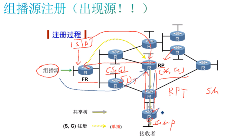 当前已经在接收者和rp之间建立了rpt树,接收者需要告诉rp我需要接收哪个组播组的流,其过程是通过与接收者连接的叶路由器来完成的(接收者只是个接收组播流量的终端)。告诉rp-因为在pim-sm中,只有rp来进行流量的转发,所有的组播流量都会被先发到rp,如果rp不知道这个组播组存在,就不能继续转发组播流量。so需要先让rp知道这个网络里存在这个组播组的接收者存在。